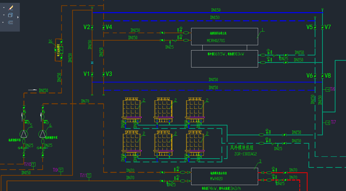 系統簡介:本次項目采用地源熱泵復合系統技術,辦公樓和綜合樓區域采用大型螺桿式地源熱泵機組配合風源熱泵模塊機組,為整個項目提供制冷、采暖和生活熱水;其中全熱回收式模塊機制備生活熱水。整個項目采用了二次系統設計,一次系統配置蓄能罐、二次系統采用了變頻技術。